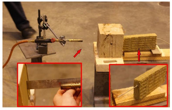 P1a ÷ P5a specimens with an average density of 110.50 kg/m³ and P6a ÷ P10a with an average density of 105.56 kg/m³ were covered with clay plaster 5.0 mm thick. The volume density of P11 ÷ P15 specimens amounted to ca. 682.51 kg/m³ and specimens P16 ÷ P20 were 829.81 kg/m³. The density was determined by measuring the weight and volume of the test material. When the plaster dried out, the specimen was exposed to a flame from a roofing torch with the flame temperature above 1000 °C for 15 min (Figure 3).