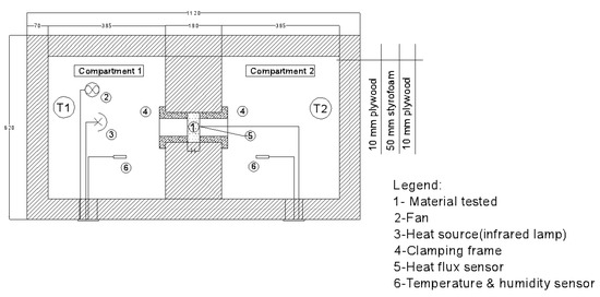Measurements were conducted in steady heat flux conditions using a two-compartment “heat box” with heat flux density sensors, according to PN-EN 12667:2002 standard [52]. The sample to be tested was put between compartments and sealed with multi-element spacer frames (Figure 5). The source of heat in the compartment was a 250 W Helios heat lamp. Temperature was measured with a temperature sensor PT-100 (Manufacturer name: Transfer Multisort Elektronik Sp. z o.o., Łódź, Poland) with a measurement accuracy of 10% and a humidity meter HR-202 (Manufacturer name: Conrad Electronic Sp. z o.o., Cracov, Poland) with a measurement accuracy of 5% RH and measurement response time <10 s.