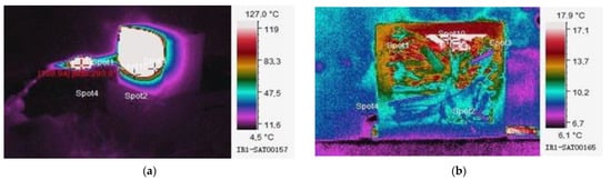 (a) Temperature distribution on the surface of a cube exposed to flame after t = 25 min (a maximum range of the thermal imaging camera was 300 °C); (b) Temperature distribution on the opposite side of the sample after t = 25 min.