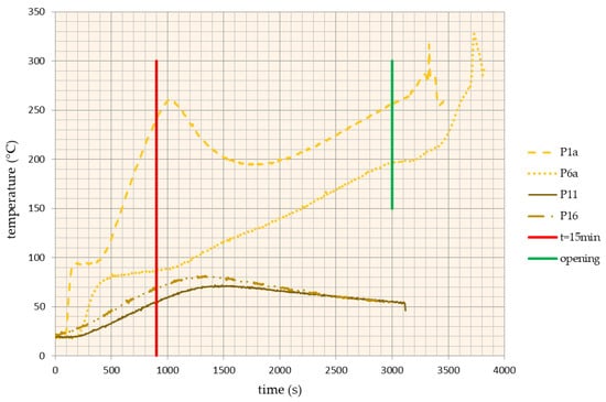 The test was conducted on samples P1a ÷ P10a, P11 ÷ P15, and P16 ÷ P20 following the methodology given in Section 2.1. For all samples, the time and distance from the heat source, ambient temperature, and depth of temperature measurement were constant. The analysis of values obtained allowed differentiating three characteristic phases of the measurement: