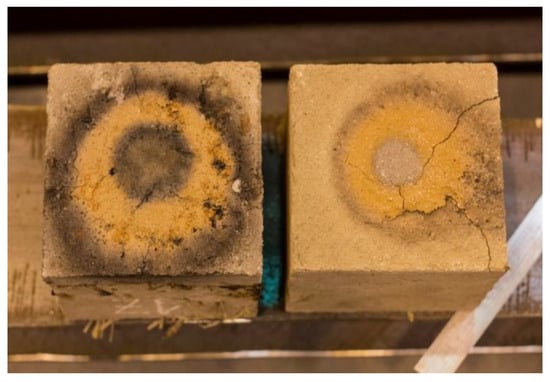 When the torch was on again, the temperature rise for the P1a sample occurred by ca. 1 min. faster than for the P6a sample. It may be explained with the fact that the straw stems inside the P1a sample were parallel oriented to the heat flow, and thus, they did not make such a good thermal barrier. For the same reason, the temperature at a depth of 50.0 mm rapidly increased in the first phase from ca. 20 °C to ca. 90 °C, which was more dynamically than in any other samples tested. In addition, during this test, characteristic maintaining of the constant temperature was observed at approximately 90 °C in case of samples P1a and P6a. When moisture evaporated from the material structure, the rapid growth of temperature remained. When the torch was off at the beginning of phase II, the temperature rise trend remained for the next 2 min, and then, the temperature started to go down from 260 °C to approximately 195 °C. Most likely, however, embers stayed in a part of the samples, as smoke was coming out from the inside through cracks in the clay plaster (Figure 10). After approximately 30 min from the start of testing (i.e., after ca. 15 min from starting the torch), the temperature of the P1a sample at a depth of 50.0 mm started to grow again with a rate of ca. 30 °C/min, such as in case of P6a. When the compartment was opened in phase III, a further growth of temperature was observed. Due to the unlimited access of air to glowing straw, its ignition took place, which was observed as a sudden temperature rise at the end of the graph. A further decrease in temperature visible in the graph was associated with extinguishing of the sample (Figure 8).