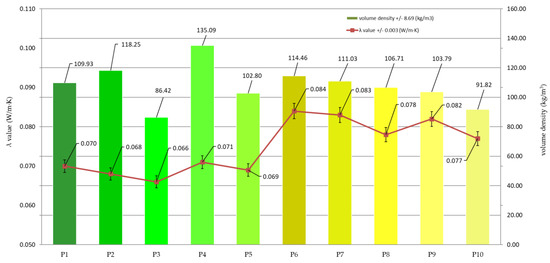 - Based on test results of the heat transfer coefficient, the relation was found between the volume density and the heat transfer coefficient (λ). The higher the density of samples, the lower were their thermal-insulating properties, as shown in Figure 11. This is related to the lower number of air gaps in the material structure.