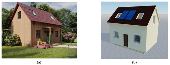 (a) Visualization of the selected building design; (b) Model made in ArCADia-Architektura software.