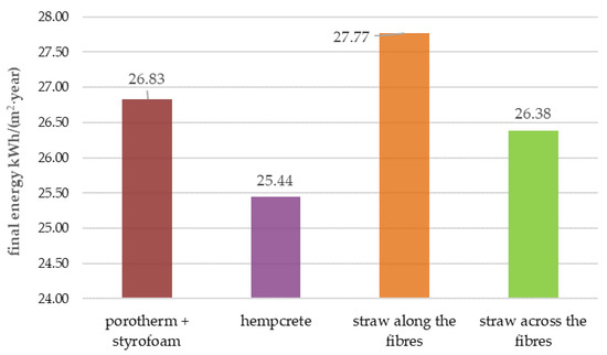 Using computational modeling of architecture, a demand for final energy in the building was determined in four variants, which differed in the type of material used for the construction of external walls. Each variant based on natural materials meets the technical requirements in force in Poland since 2021 [57]. The building constructed in the straw bale technology with straw stalks arranged parallel to the heat flow reached the result of Ek = 27.77 kWh/m2·year. Turning the straw stalks and changing their direction to perpendicular to the heat flow caused a reduction of the final energy to a level of 26.38 kWh/m2·year. The lowest value of energy needed to heat the designed building was achieved by the building made of hemp–lime composite, i.e., Ek = 25.44 kWh/m2·year. Each of these variants may be successfully used as the alternative for conventional construction, which obtained the result of Ek = 26.83 kWh/m2·year.