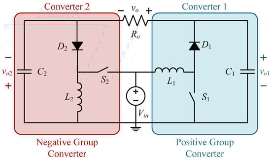 In [20] the differential connections are derived from two basic converters of different groups, so that the differential voltage is the sum of the output voltages of each of the basic converters, as shown in Figure 1, where a boost converter (positive group—Converter (1) is connected with a buck-boost converter (negative group—Converter (2). In this case, the differential voltage only depends on the output voltage of each basic converter: