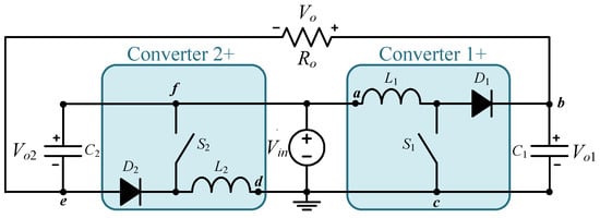 Conversely, in the differential connection of basic converters of the negative group (Figure 4b) the input voltage (Vin) is positive and contributes to increasing the differential output voltage (Vo−). As a consequence, a parcel of the power supplied by the input source is directly transferred to the load. Hence, Converters 1− and 2− need to process less power than the load requires, which is the main feature expected from the 3P converters.