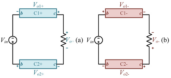 In the differential connection of basic converters of the positive group (Figure 4a) the input voltage (Vin) is negative and contributes to decreasing the differential output voltage (Vo+). It results in the circulation of non-active power [25] through the differential converter but does not imply the direct transfer of power from the input to the output. In light of this, to compensate for the reduction of the differential output voltage caused by the input voltage, the Converters 1+ and 2+ need to process more power than the load requires.