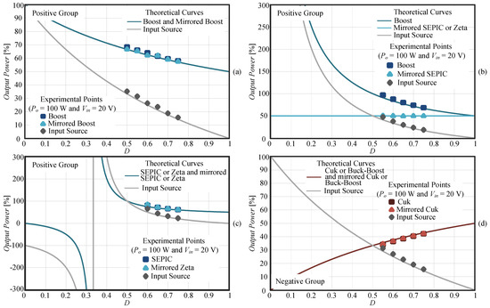 Theoretical curves and experimental points considering D = D1 = D2 at Po = 100 W and Vin = 20 V for the positive group: (a) boost and mirrored boost converters (positive group); (b) boost and mirrored SEPIC converters (positive group); (c) SEPIC and mirrored Zeta converters (positive group); (d) Ćuk and mirrored Ćuk converters (negative group).