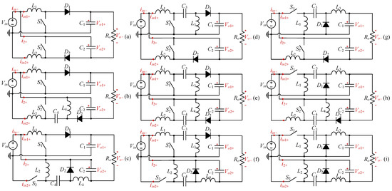 Differential converters of positive group: (a) boost with mirrored boost, (b) boost with mirrored SEPIC, (c) boost with mirrored zeta, (d) SEPIC with mirrored boost, (e) SEPIC with mirrored SEPIC, (f) SEPIC with mirrored zeta, (g) zeta with mirrored boost, (h) zeta with mirrored SEPIC and (i) zeta with mirrored zeta.
