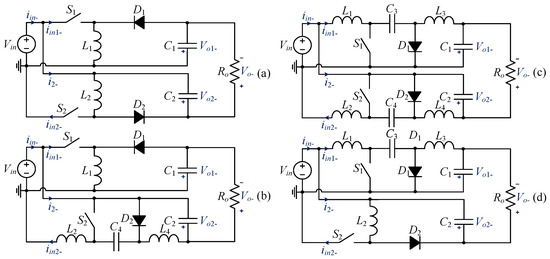 Differential converters of negative group: (a) buck-boost with mirrored buck-boost, (b) buck-boost with mirrored Ćuk, (c) Ćuk with mirrored Ćuk and (d) Ćuk with mirrored buck-boost.