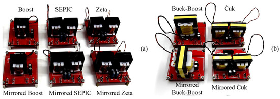In order to verify the theoretical analysis, ten prototypes (boost, SEPIC, zeta, Ćuk, buck-boost, and their mirrored versions) were assembled, as shown in Figure 9a, for the positive group, and in Figure 9b for the negative group. The specifications and components of the prototypes are exhibited in Table 2.