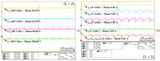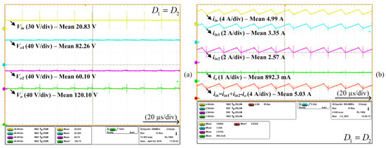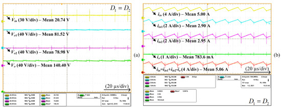Experimental results for the differential connection between the boost and the mirrored SEPIC converters with the same duty cycle (D = D1 = D2 = 0.75) are shown in Figure 11, and with different duty cycle (D1 = 0.7142 and D2 = 0.777) in Figure 12. The output voltage (Vo) is the same in both cases, however, the partial voltages (Vo1 and Vo2) are different [Figure 11a and Figure 12a]. In the first case (D1 = D2) Vo1 is around 80 V and Vo2 is 60 V, whereas in the second case (D1 ≠ D2) Vo1 and Vo2 are 70 V. This last condition ensures that the converters process the same power. The voltages when D1 = D2 follow the equations present in the second line of Table 1 and when D1 ≠ D2 follow the Equations (20) and (21). In both cases, the output voltage is given by Equation (2). The input currents of each of the basic converters in the first case (Figure 11b) are different (iin1 ≈ 3.35 A and iin2 ≈ 2.57 A), and in the second case (Figure 12b) are the same (iin1 ≈ iin2 ≈ 2.9 A). It means that the duty cycles can be adjusted to balance the power processed by each converter, as detailed in Section 3.