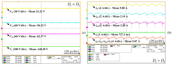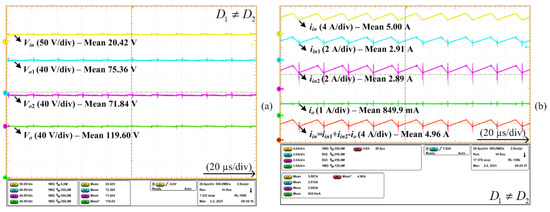 Experimental results for boost with mirrored SEPIC converters with different duty cycle (D1 ≠ D2): (a) input voltage (Vin), partial output voltages (Vo1 and Vo2), and differential output voltage (Vo); (b) input current (iin), input current of Converters 1 and 2 (iin1 and iin2), output current (io), and input current calculated by the math channel (iin = iin1+iin2−io).