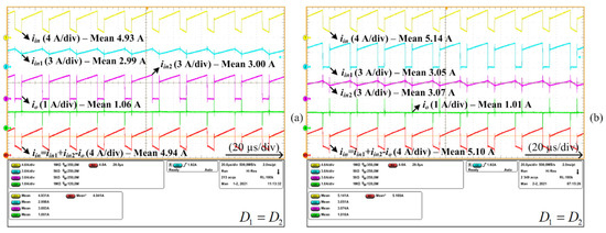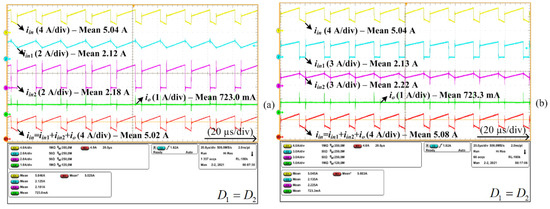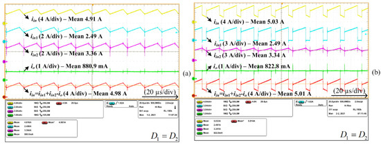 Experimental results with the same duty cycle (D = D1 = D2): (a) Ćuk and mirrored buck-boost converters; (b) buck-boost and mirrored Ćuk converters. Input current (iin), input current of Converters 1 and 2 (iin1 and iin2), output current (io), and input current calculated by the math channel (iin = iin1+iin2−io).