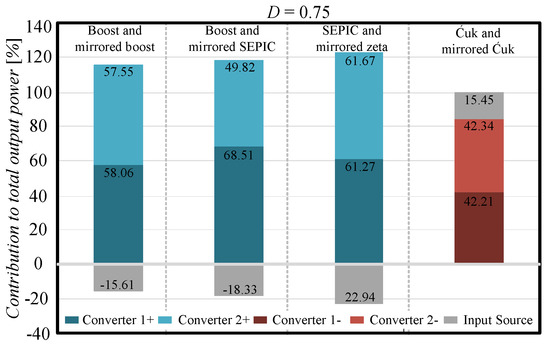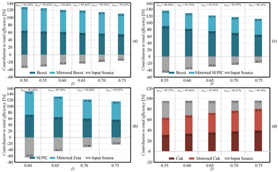 The contribution of the Converter 1, Converter 2 and input source in relation to total output power and efficiency is presented in Figure 19, considering Vin = 20 V, Po = 100 W and different duty cycles values. Figure 19a,b, and c represent the converters of the positive group (boost and mirrored boost converters, boost and mirrored SEPIC converters, and SEPIC and mirrored Zeta converters, respectively).