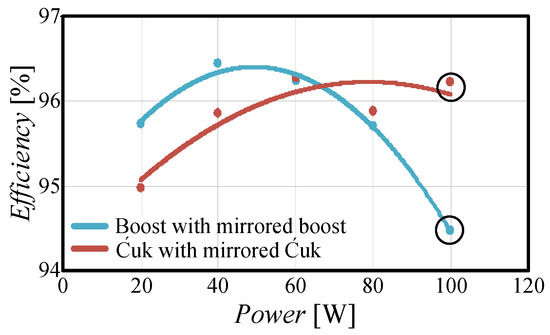Experimental efficiency curves in relation of output power for boost with mirrored boost and Ćuk with mirrored Ćuk.
