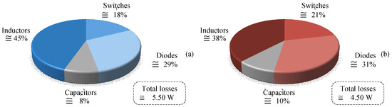 Figure 21 shows the theoretical distribution of losses per component when the output power is 100 W (highlighted points in Figure 20) for the boost with a mirrored boost converter (Figure 21a) and for the Ćuk with mirrored Ćuk (Figure 21b). For both converters, the component responsible for the greatest parcel of losses is the inductor.