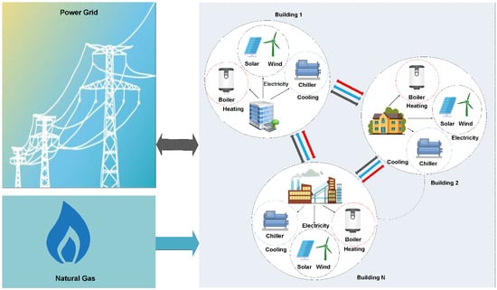 A zone of neighboring buildings driven by RES and utility, sharing their electricity, heating and cooling with other buildings.