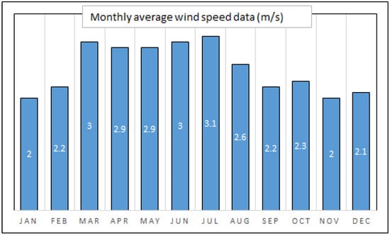 where, is the area swept by WT blades, v is the wind speed, is the efficiency coefficient of WT and is air density. The Weibull Probability Distribution (WPD) is used to produce the wind speed profile for a known wind average speed and shape parameter k. The average monthly wind speed for Islamabad is shown in Figure 2 [] for the area of Zero Point in Islamabad city, this data was accessed on 1 December 2021 at 1300 h. WPD of wind having k of 1.8 and annual average speed of 2.5 m/s for Islamabad, Pakistan, is considered. When we apply Equation (1) to WT(BWC-Excel-R/48) having a height of 7 m, the daily average output comes out about 20 kWh.