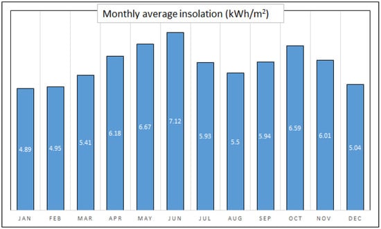 where, can be found by dividing PV generated power (in kW) by the panel’s area m. Islamabad’s month-wise average insolation is presented in Figure 3 [] for the area of Zero Point in Islamabad City with panel angle of 45 degree, this data was accessed on 4 November 2021 at around 1500 h. It can be observed from the graph that its highest value is in the month of June, while the lowest is in December. Considering a standard size PV having 1.63 m area, PR value of 0.75 and 0.26 kW output power, the PV array size for a building that can give 14.4 kWh daily electrical energy yield for the month of November needs to have area of 20 m. This means that it requires a total of 9 panels. Whereas, for the month of June, due to the increase in I, the electrical energy yield increases up to 17.1 kWh per day. In the simulation part, according to the area and load demand of building, the quantity of PV arrays will be selected.