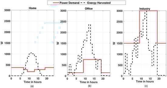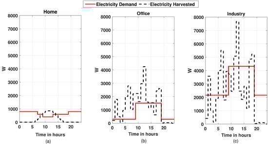 Electricity demand and harvested electricity of 24 h for the month of November, (a) for the home building, (b) for office building, and (c) for industry building.