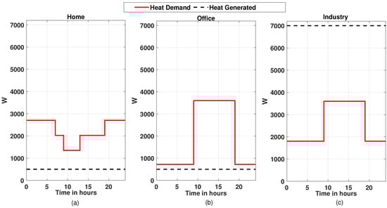 Heating demand and generation of 24 h for the month of November, (a) for the home building, (b) for office building, and (c) for industry building.