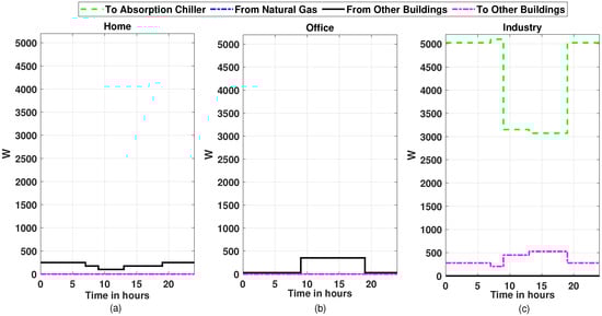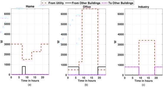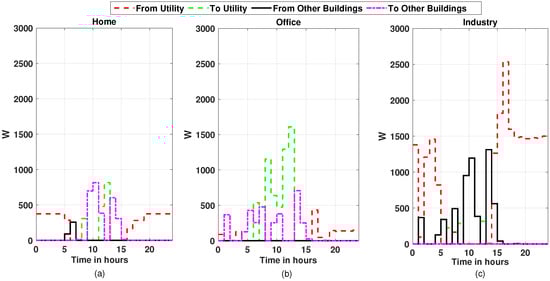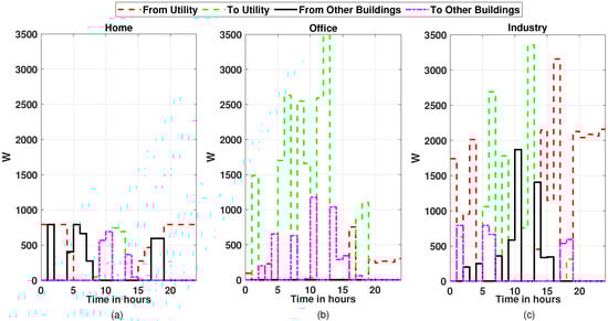Electricity cooperation among the buildings for 24 h in the month of November, (a) for the home building, (b) for office building, and (c) for industry building.