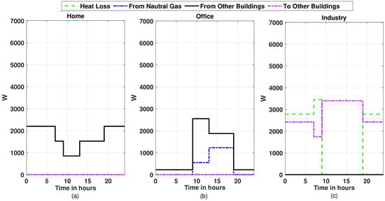 Heating cooperation among the buildings for 24 h in the month of November, (a) for the home building, (b) for office building, and (c) for industry building.