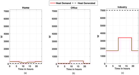 Heating demand and generation of 24 h for the month of June, (a) for the home building, (b) for office building, and (c) for industry building.