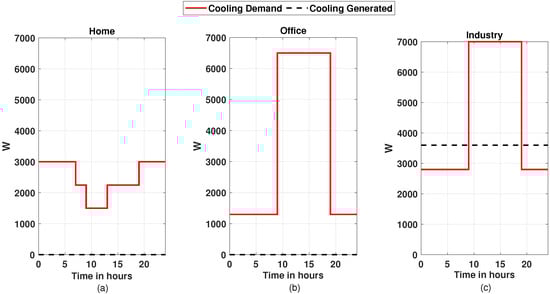Cooling demand and generation of 24 h for the month of June, (a) for the home building, (b) for office building, and (c) for industry building.