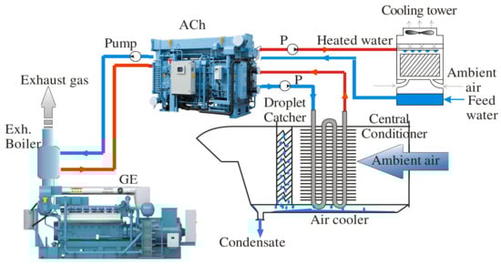 A schema of a typical system of cogenerative gas engine heat conversion by ACh with engine intake air cooling in the air cooler of the central conditioner by chilled water from the ACh: OC-oil cooler; JC-jacket cooler; SACLT and SACHT -low- and high-temperature scavenge air coolers.