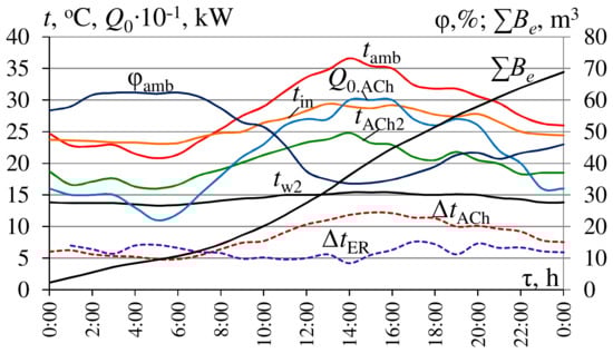 Daily variations in temperature tamb and relative humidity φamb of ambient air, temperature of air at the gas engine inlet tin, and at the high-temperature air cooler outlet tACh2 = tHT, ΔtACh = ΔtHT = tamb − tHT; ΔtER = tin − tHT.