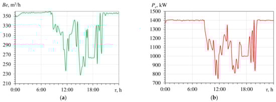 Daily variation of volume gas consumption Be (a) and electric power Pe (b) of the gas engine against time τ.
