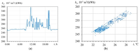 Specific volume gas consumption be aa a daily variation against time τ (a) and inlet air temperature t (b).