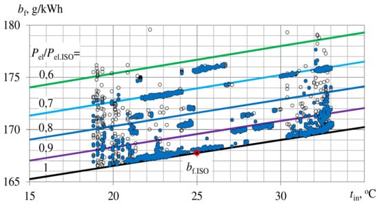 Variation of mass-specific fuel consumption bf against inlet air temperature tin at various loads Pel/Pel.ISO, Pel—electrical power as monitored data; Pel.ISO—rated electrical power at ISO ambient air parameters: tamb = 25 °C, and relative humidity φamb = 30%.