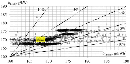 A deviation of calculated values of mass-specific fuel consumption bf.calc from monitoring data bf.monit is within the range of 10% with a probability of 95% and within the range of 5% with a probability of 65% (Figure 8).