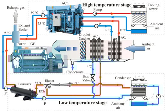 A new concept based on combined two-stage EIAC in ACh and ECh would enable the stabilization of the engine intake air at a low temperature. It could be realized by using chilled water from an ACh as a coolant in a high-temperature engine inlet air cooler and boiling refrigerant fed from an ECh—in a low-temperature air cooler [].