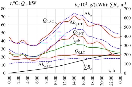 Daily variation of thermal loads Q0.HT and Q0.LT on high- and low-temperature air coolers and Q0.AC on the whole two-stage air cooler; Q0.HT and decreases of specific fuel consumption ∆be.HT, ∆be.LT, ∆be, accordingly, and summarized volume gas-saving ΣBe (Mykolayiv region, south of Ukraine, 2017).