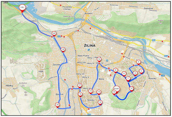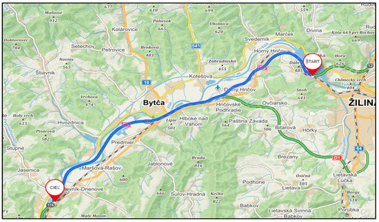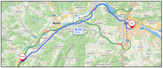 The out-of-town vehicle ride is represented by the section between Považská Bystrica and Žilina (Figure 3). The beginning of the measuring route is located at an altitude of 312 m above sea level and ends at 353 m above sea level. The measurements were performed on a 1st class road. The “number” of the path is 16. This section is 26.5 km in length, and the vehicle took 27 min to complete the section. The measuring sections were traversed one after the other without a break. The vehicle travelled at speeds of up to 80 km/h outside of the city.