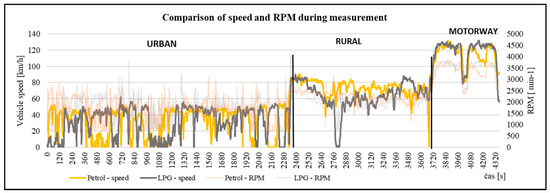 The performed measurement is reflected in Figure 4, where it is possible to monitor the speed and revolutions of the vehicle during the measurement procedure. Individual speeds and revolutions are compared to each other. From the graph, it is possible to observe the apparent division of the measuring section into the city part, the time spent outside of the city, and the portion of the course where the vehicle was on the motorway. The graph and the individual curves correspond exactly to these divisions.