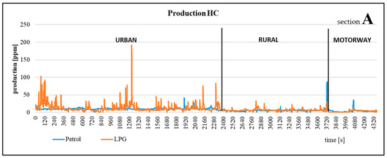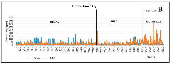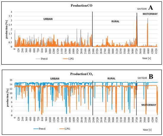 In Figure 7, it is possible to monitor the course of HC (section A) and NOx (section B) production while driving. The course of HC production is almost identical as the course identified in gasoline and LPG combustion. However, larger deviations can be observed in the LPG combustion in the urban part of the driving cycle. In the second part of the picture, we follow the course of NOx production, the production of which is higher during gasoline combustion higher. We can especially observe this phenomenon in the urban part of the cycle. However, when driving on a motorway section, NOx production is higher when burning LPG. This can be observed in the final part of the graph, where the orange curve (LPG) indicates high deviations. The CO and CO2 production processes can be seen in Figure 8 in the next section.
