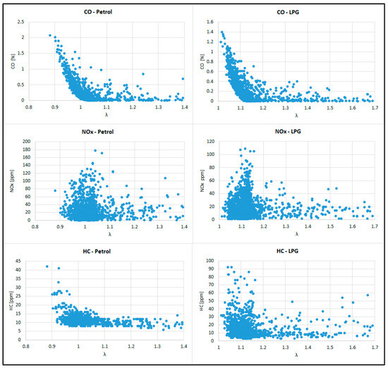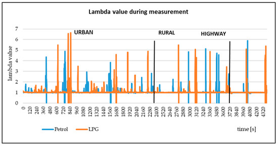 The difference in the calculated components of the CO, HC, and NOx exhaust emissions between petrol and LPG fuels can also be understood in connection with one of the most important parameters, the air–lambda excess factor. As seen in Figure 18, the preparation of the fuel mixture on the gasoline fuel takes place to a significant degree at a lambda value of 1. When the vehicle is running on LPG fuel, the coefficient of excess air in particular is in the range of 1.1 to 1.15.