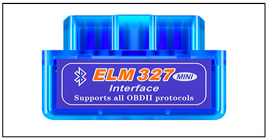 The key task for the measurement was to select the correct application and diagnostic tool. The research was carried out using the Torque Pro application (Bosch KTS 540, AutoCom and mobile application were analyzed) in connection with device ELM 327 Mini Interface (Figure 10). We chose the ELM 327 Torque Pro application to perform the measurements. The ELM 327 displays real-time detailed data such as engine speed, calculated engine load, coolant temperature, fuel system condition, vehicle speed, and more. It is also able to clear and identify fault codes written in the MIL engine control unit (“Check Engine” indicator light) [45].