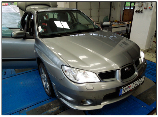 When performing the measurements according to the RDE, a Subaru Impreza vehicle (Figure 11) with technical parameters (Table 3) was selected, and the vehicle was powered by an internal combustion engine fueled by petrol. The vehicle is subject to the EURO 4 emission standard and meets the requirements of Council Directive 70/220/EEC. The vehicle and its power were not modified in any way before the measurements. The additional engine modifications could result in changes, which are described in the study by Mucková et al. [46]. To evaluate the production of emissions in the individual environments that were planned during the ride (city, out of town, highway), a vehicle powered by an alternative drive was also chosen. This drive was LPG. The tested vehicle was selected due to the availability of petrol/LPG dual propulsion. The vehicle underwent a valid technical inspection, and the gasifier underwent a regular inspection at the time of the test. Part of the test performance was to check the technical condition of the engine by reading the fault memory via OBD. The inspection was performed using a BOSCH KTS 560 device. With regard to the selection of the vehicle, it can be further argued that approximately 50,000 LPG vehicles are still in operation in the Slovak Republic, which represents approximately 5% of the total number of registered passenger cars with a petrol engine. However, in Central EU countries, we are seeing an increase in the number of LNG trucks. LNG-powered trucks represent a step forward in the field of alternative fuels and, in particular, in reducing the production of exhaust emissions from transport activities. The authors addressed this issue and have provided a detailed overview of low-emission fuels. Karczewski et al. confirmed that alternative fuels could be the key to reducing CO2 and other greenhouse gas emissions that are produced during the combustion process [33].
