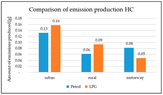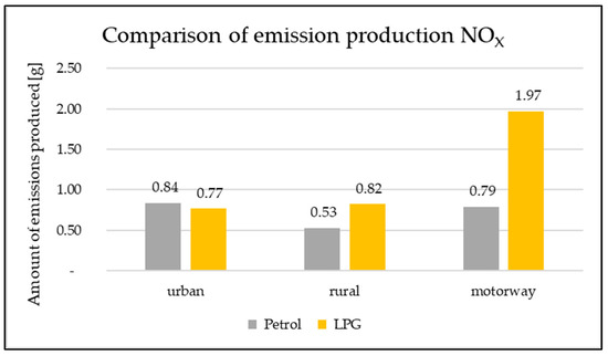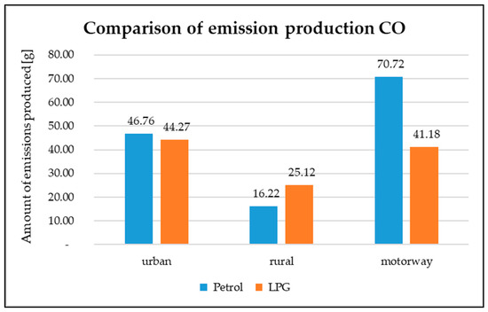As for CO production, the biggest difference can be observed when driving on the highway section, where 70.72 g of petrol was produced and 41.18 g of CO was produced when burning LPG. This difference represents a decrease of almost 41.7% compared to gasoline combustion. Thus, it can be stated that from this point of view, driving on LPG is assessed as being more environmentally friendly.