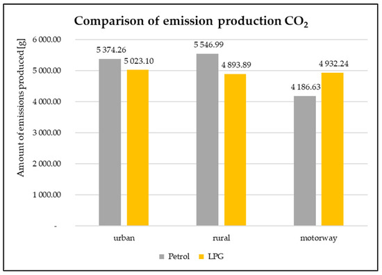 The present research monitors the production of exhaust emissions during vehicle operation in real conditions. From the evaluation of the results of individual measurements, it is possible to state to what extent the LPG combustion represents an ecological alternative. We will compare the absolute amount of emissions produced on the monitored route. The results of the measurements show that when driving in the city, a vehicle powered by LPG was able to achieve lower values of exhaust emissions than when burning gasoline. However, when monitoring HC production, production was higher when burning LPG. When monitoring driving outside the urban environment, we observed that the vehicle had lower emissions when burning gasoline. However, when monitoring CO2 production in an urban area, production was lower when burning LPG. When the vehicle was driven on the motorway section, the production of CO2 and NOx emissions was higher when burning LPG. The production of other monitored emissions (CO, HC) was only higher when burning gasoline. This comparison makes it possible to monitor the extent to which the fuel may affect the production of exhaust emissions.