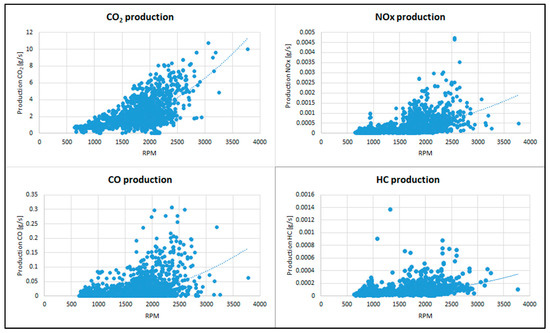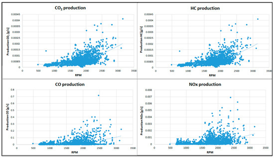 In the analysis of different concentrations of the monitored components of CO, CO2, HC, and NOx emissions, THE graphs representing the engine speed and individual emissions in g/s were prepared (Figure 16 and Figure 17). The amount of emissions produced in g/s depends significantly on the way the vehicle is driven during the RDE test. How the test vehicle is driven significantly affects the production of individual emission components. Vehicle acceleration was necessary several times during testing. In particular, CO2, and HC are affected by the current engine speed.