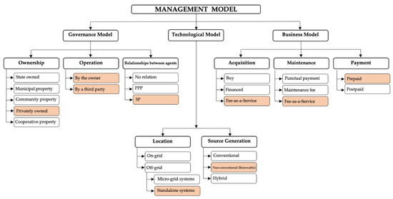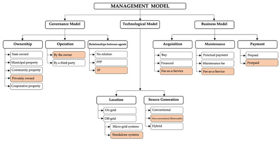 The configuration of a management model for rural electrification projects is complex and multifaceted. Real cases of rural electrification projects cover primarily the technological elements, project funding and the roles of the different agents involved [11], even though the terminology varies from one case to another [12]. From a wider perspective, the configuration of the management model requires the consideration of aspects relative to ownership, operation and maintenance, selection of technologies, viability and feasibility, funding, or stakeholders’ roles, among others [11,12,13,14]. This study synthetizes these elements in three fundamental components: governance model, technological model, and business model (Figure 1). While governance may often be equated to the broader idea of project management, in rural electrification projects its scope extends to ownership of the initiative or project, the operation of energy provision and the relationships between actors/stakeholders [13,14]. A similar clarification is required in the case of the business model; while some may limit this component to the funding of the project, the business model covers more aspects, such as system acquisition, maintenance, or payment methods [12].