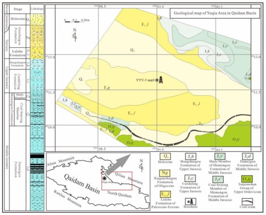 The Yuqia area is located in the central part of the northern Qaidam Basin, which is located in central-western China, and is bordered by Dakendaban Mountain in the north and east and Lvliang Mountain in the south (Figure 1). The Middle Jurassic Qaidam Basin consists of the Dameigou Formation in the lower part and the Shimengou Formation in the upper part. The Shimengou Formation is further divided into the Coal-bearing Member in the lower part and the Shale Member in the upper part. The Shale Member of the Shimengou Formation is characterized and discussed in detail in this paper.