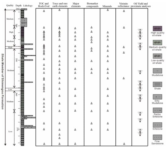 Although oil shales of all qualities in the Shale Member of the Shimengou Formation were formed in a semi-deep to deep lake sedimentary environment [23,24], different organic matter enrichment models apply to each quality oil shale.